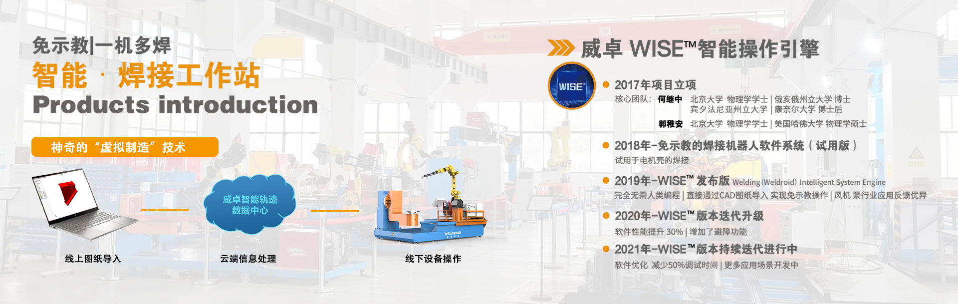威卓專注于智能全自動焊接機器人這個新興的市場,擁有完整的核心技術 和知識產權,通過傳感器和軟件技術對普通焊接機器人進行智能化, 實現替代人工,降低生產成本,提高焊接質量的目標。